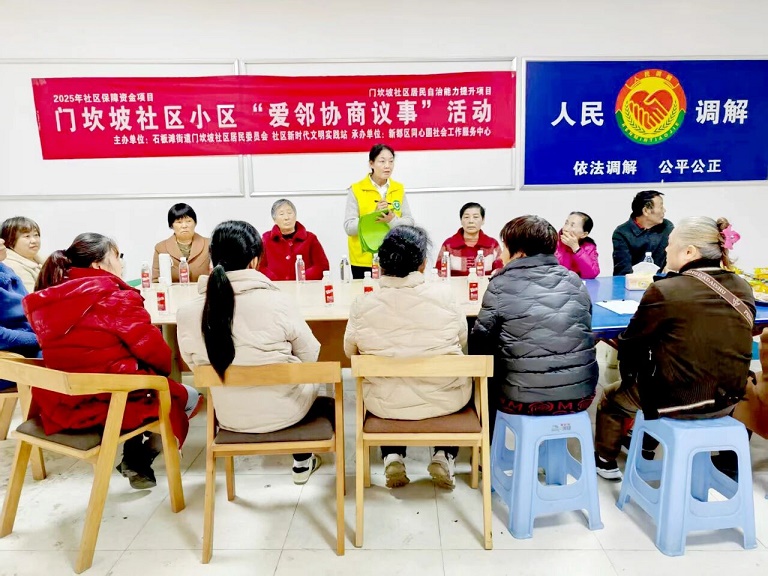 2025年11月7日上午,石板滩街道门坎坡社区居民委员会、社区新时代文明实践站联合同心圆社会工作服务中心,在广达路和谐家苑开展“爱邻议事聚民心,共建和谐幸福家”协商议事活动。社区工作人员、小区居民代表、小区门岗负责人、社区志愿者等20余人齐聚一堂,以“面对面”交流形式共商小区事务。